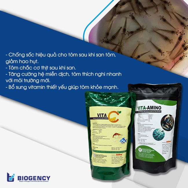 - Trong 1–2 ngày đầu sau khi sang tôm, nên bổ sung Vitamin và dinh dưỡng để giúp tôm phục hồi nhanh. Sản phẩm VITA-AMINO từ BIOGENCY bổ sung nhiều Vitamin thiết yếu như A, D3, K3 và E giúp tăng sức đề kháng, kích thích tôm ăn mạnh và cải thiện quá trình tăng trưởng.