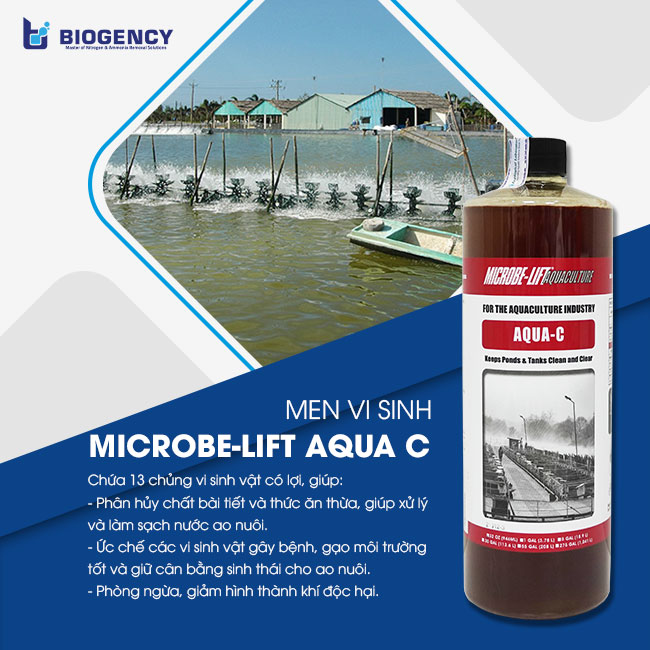 Bổ sung các sản phẩm men vi sinh giúp giảm NH3, NO2, phân hủy hữu cơ, cắt nguồn sinh CO2/H2S (một trong những nguyên nhân làm pH dao động). Dòng sản phẩm men vi sinh Microbe-Lift AQUA C nhập khẩu từ Mỹ với thành phần gồm 13 chủng vi sinh có lợi sẽ giúp bà con kiểm soát Nitơ, Photpho và chất hữu cơ, ổn định màu nước và tảo có lợi cho ao nuôi.