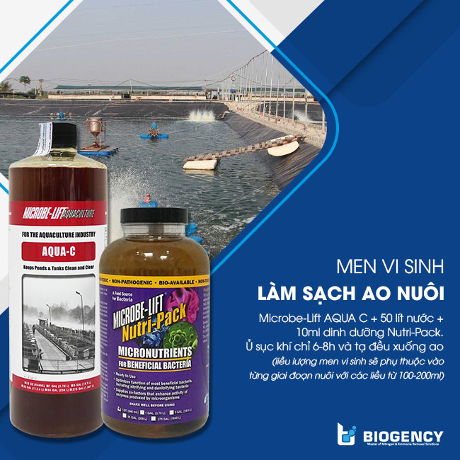 Cách dùng: Men vi sinh Microbe-Lift AQUA C + 50 lít nước + 1kg mật rỉ đường hoặc 10ml dinh dưỡng Nutri-Pack, ủ sục khí chỉ 6-8h và tạ đều xuống ao (liều lượng men vi sinh sẽ phụ thuộc vào từng giai đoạn nuôi với các liều từ 100-200ml).
