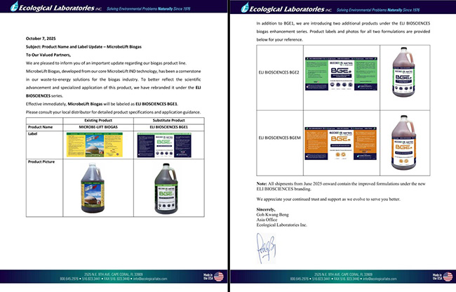 BIOGENCY căn cứ vào thông báo chính thức của Nhà sản xuất Ecological Laboratories Inc. chúng xin thông báo đến quý khách một cập nhật quan trọng liên quan đến dòng sản phẩm MICROBE-LIFT BIOGAS như sau: