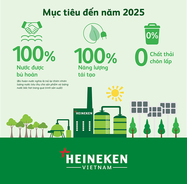 Một số doanh nghiệp tiên phong đã đặt ra các mục tiêu bền vững rõ ràng, điển hình như Heineken Việt Nam với cam kết đến năm 2025 đạt 100% bù hoàn nước (hoàn trả cho thiên nhiên lượng nước sử dụng trong sản phẩm và lượng nước bốc hơi trong quá trình sản xuất), sử dụng 100% năng lượng tái tạo và không phát sinh chất thải chôn lấp.